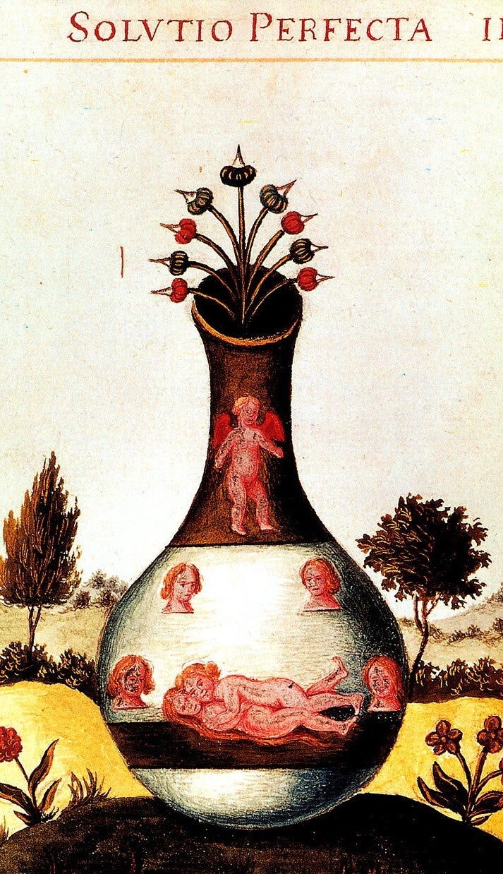 - Oplossing ('Solution'): de vaste materie wordt vloeibaar gemaakt door een krachtig 'solvent'; een terugkeer naar de prima materia